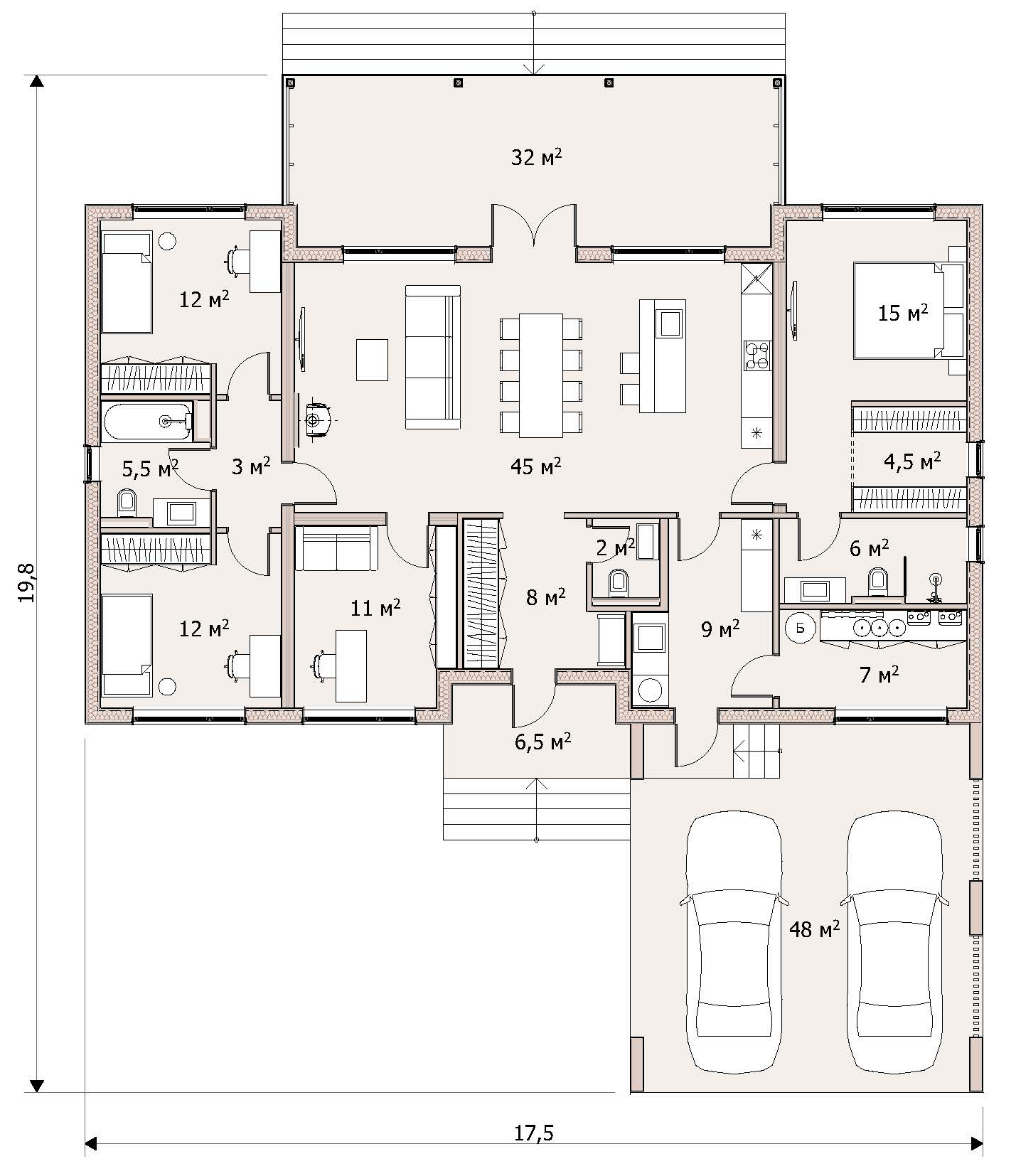Просторный дом с просторной террасой и навесом на 2 автомобиля
